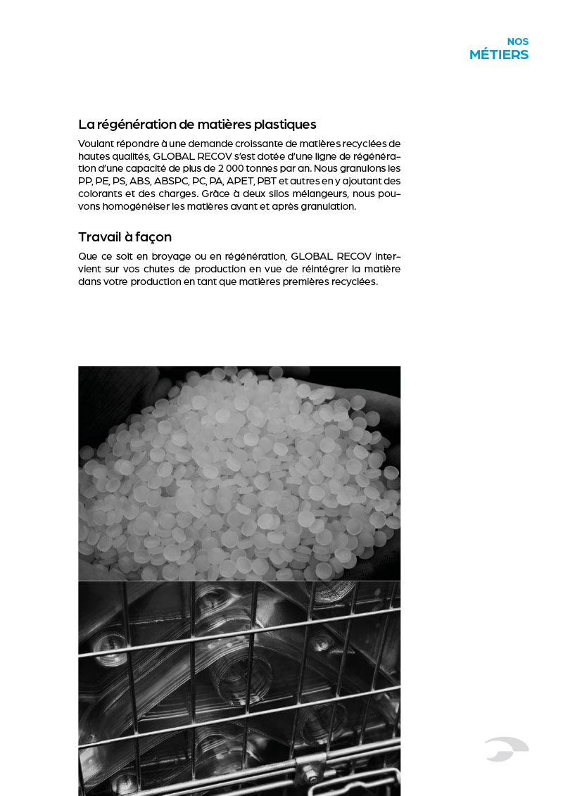 GLOBAL RECOV recycle et valorise une large gamme de rebuts de productions plastiques sous différentes formes : pièces, carottes, squelettes, purges, fin de série/lots, sorties d’inventaire, matières broyées complexes ou avec inserts. Notre usine est équipée de ligne de broyage et de déchiquetage d’une capacité de plus de 8 000 tonnes. Nous intervenons dans les secteurs de l’automobile, de la cosmétique, de l’emballage, du batiment, de l’alimentaire et des biens d’équipements. GLOBAL RECOV valorise les PP, PE, PS, ABS, ABSPC, PC, PA, APET, PBT et bien d’autres encore, avec ou sans charges, mono-matière ou complexes.